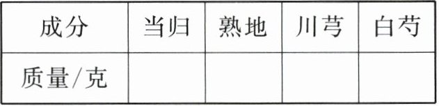 4. 唐朝时期,我国的中医药水平达到了新的高峰,一些著名的药方甚至沿用至今。《四物汤》就是一个著名的药方,被誉为“养血第一方”,它由当归、熟地、川芎、白芍四味中药组成。一副普通的《四物汤》配方:当归 $ 10 $ 克,是熟地的 $ \frac{5}{6} $,川芎是当归的 $ \frac{4}{5} $,当归比白芍少 $ \frac{1}{6} $。请写出计算过程,并把一副普通的《四物汤》配方填写在下表中。(6分)