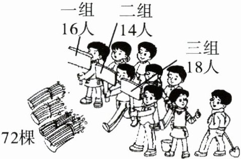 一组:$72×\frac{16}{16+14+18}=24$(棵) 二组:$72×\frac{14}{16+14+18}=21$(棵) 三组:$72×\frac{18}{16+14+18}=27$(棵) 答:一组应植树24棵,二组应植树21棵,三组应植树27棵。