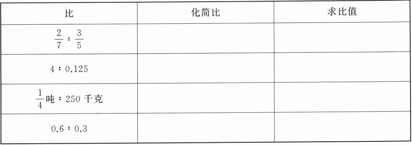 $\frac{2}{7}:\frac{3}{5}$ 10:21 $\frac{10}{21}$;4:0.125 32:1 32;$\frac{1}{4}$吨:250千克 1:1 1;0.6:0.3 2:1 2