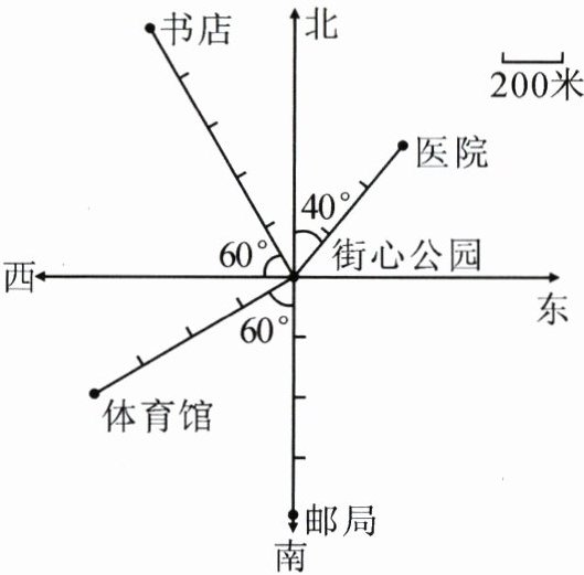 1. 书店在街心公园( )偏( )( )方向上,距离约是( )米。