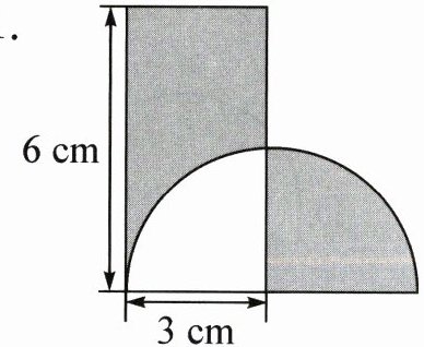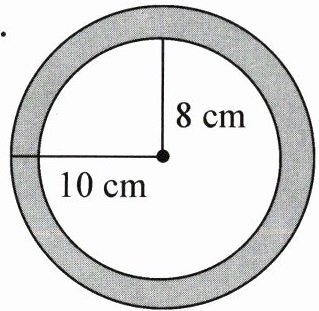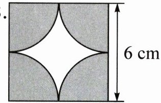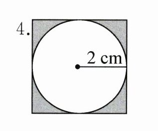 1.6×3=18(cm²) 2.3.14×(10²−8²)=113.04(cm²) 3.3.14×(6÷2)²=28.26(cm²) 4.(2×2)²−3.14×2²=3.44(cm²)