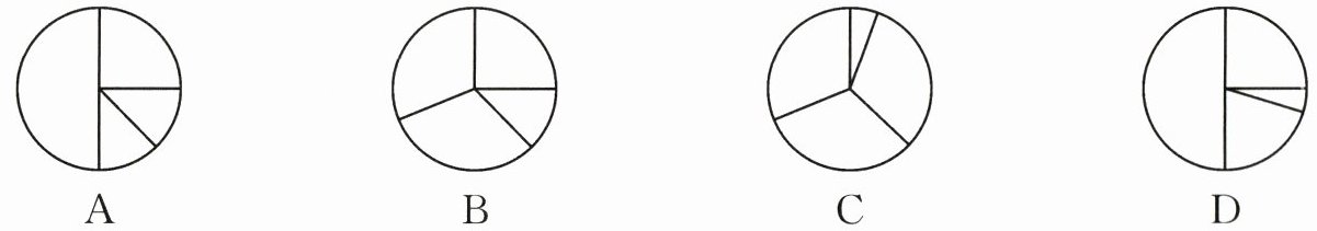 2.学校礼仪队在六年级挑选了40人做校庆活动的礼仪队员。其中,六(1)班有20人,六(2)班有10人,六(3)班有8人,六(4)班只有2人。用下面的图( )来反映统计的结果更合适。