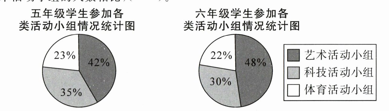 3.下面分别是五、六两个年级学生参加各类活动小组情况的统计图。五年级和六年级参加艺术活动小组的人数相比,( )。