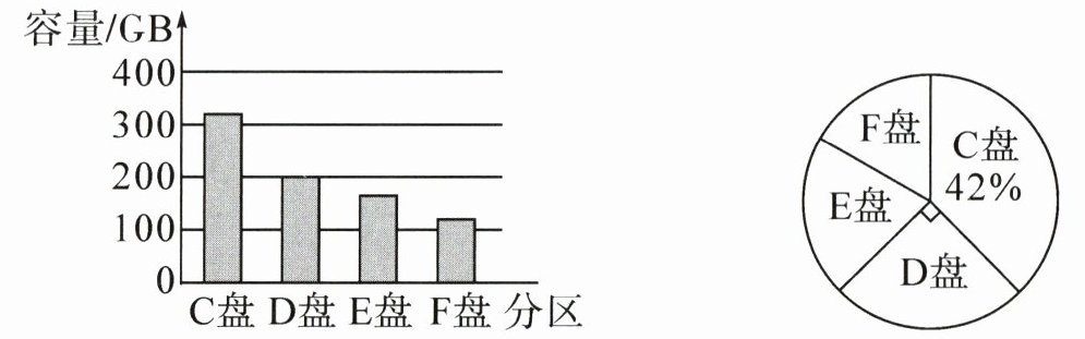 5.小唐老师将新买的一台电脑的硬盘分成了容量不相等的四个区。根据下面两幅统计图,可以知道这台电脑的硬盘总容量是( )GB,其中C盘容量是( )GB。