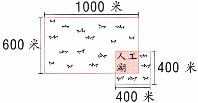 6. 某市建设了一个如图所示的小型公园,这个公园的两片绿地交汇处设置了一个人工湖,人工湖的面积是 4 公顷。这两片绿地的面积一共是多少平方米?