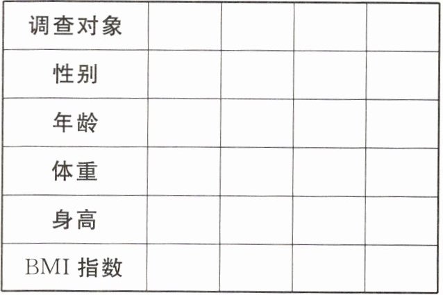 解决问题:材料:BMI指数(简称体质指数)是一个更全面的指标,它考虑了年龄、体重、身高、性别的不同,是常用的衡量人体胖瘦程度以及是否健康的一个标准。计算公式:$ BMI = \dfrac{体重(kg)}{身高(m) × 身高(m)} $。我国青少年中,12岁男性 $ BMI \geqslant 24.7 $,12岁女性 $ BMI \geqslant 24.5 $,13岁男性 $ BMI \geqslant 25.7 $,13岁女性 $ BMI \geqslant 25.6 $,属于肥胖。根据这个计算公式计算小组内各人的BMI指数并填入下表: