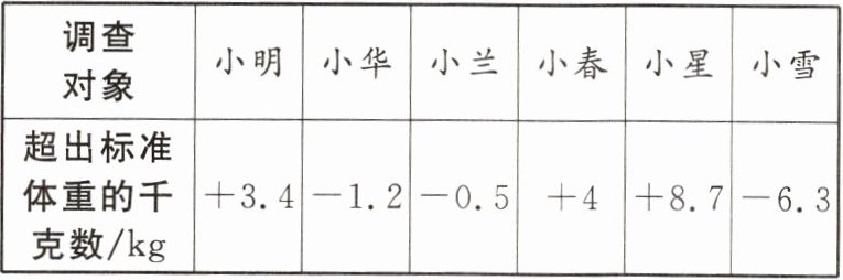 | 超出标准体重的千克数/$ kg $ | $ +3.4 $ | $ -1.2 $ | $ -0.5 $ | $ +4 $ | $ +8.7 $ | $ -6.3 $ |