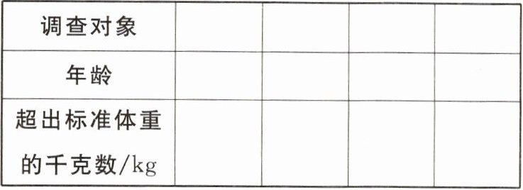 创设合作情境:请根据上述计算公式算出自己超出标准体重的千克数,由各小组长汇总并填入下表,结合表上数据及视觉感知肥胖情况,综合分析该小组同学的整体体重情况。