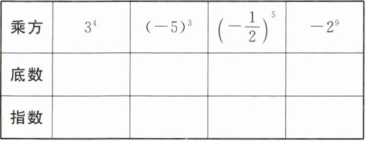 |乘方| $3^4$ | $(-5)^3$ | $(-\frac{1}{2})^5$ | $-2^9$ |