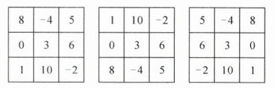 学以致用2:请将-4,-2,0,1,3,5,6,8,10这9个数,填入下面3×3的方格中,使得每行、每列、每条对角线上的三个数之和相等,构成一个三阶幻方.(至少写三种不同的填法)