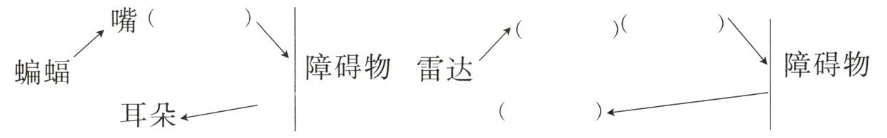 蝙蝠$\xrightarrow{嘴( )}$$\xrightarrow{}$障碍物 雷达$\xrightarrow{( )( )}$$\xrightarrow{}障碍物\xrightarrow{( )}$