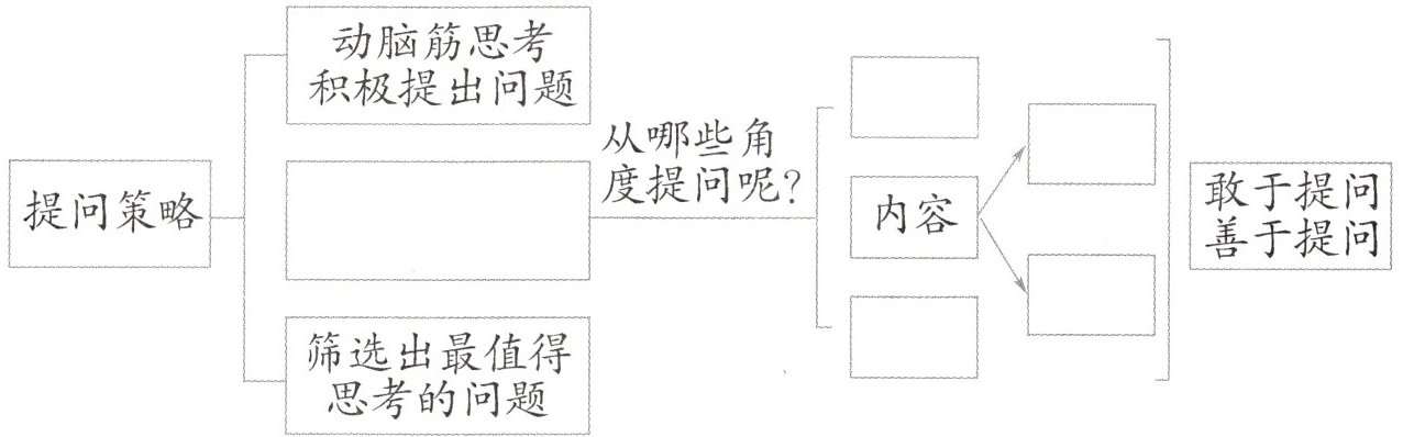 本单元我们学习了“提问”的阅读方法,相关的知识你都掌握了吗?让我们运用这些知识共植“知识树”。