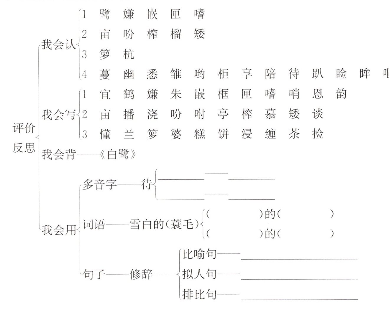 | 我会用 | 多音字——待$\begin{cases}______\\______\end{cases} $词语——雪白的(蓑毛$)\begin{cases}( )$的( )\ )的$( )\end{cases} $句子——修辞$\begin{cases}$比喻句——______\\拟人句——______\\排比句$——______\end{cases} $|