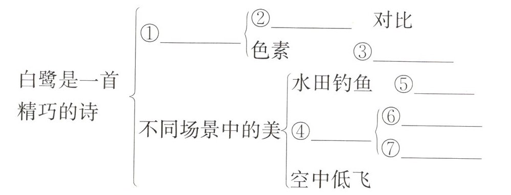 五、请你尝试补充下面的思维导图,梳理本课写了白鹭哪些方面的美,运用了何种修辞手法。可以根据需要增减分支。
