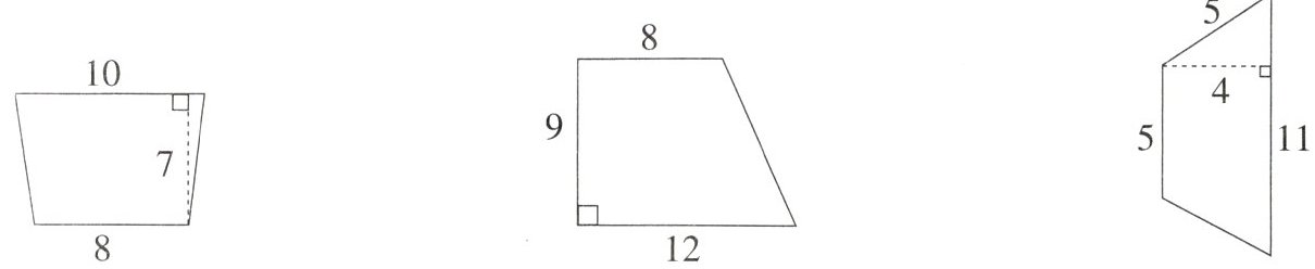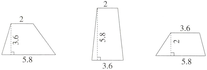 一、用长 $2$ cm、$3.6$ cm 和 $5.8$ cm 的三条线段做梯形的上底、下底和高,可以得到下面三个不同的梯形。比一比哪个梯形的面积最大。