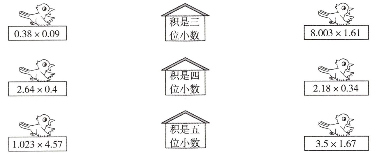 积是三位小数—2.64×0.4,3.5×1.67;积是四位小数—0.38×0.09,2.18×0.34;积是五位小数—8.003×1.61,1.023×4.57