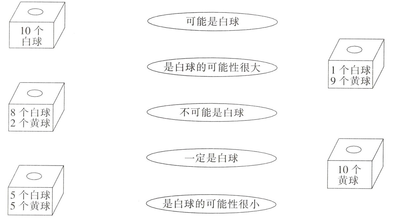 二、从下面的 5 个盒子里分别摸出 1 个球,将结果连起来。