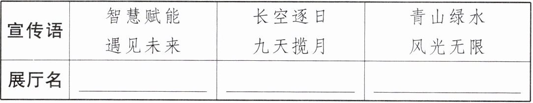 (1) 在科技馆里,同学们参观了航空航天厅、低碳新能源厅和人工智能厅。小华同学为三个展厅各写了一则宣传语(见下表),请你在表中填写与宣传语对应的展厅名。