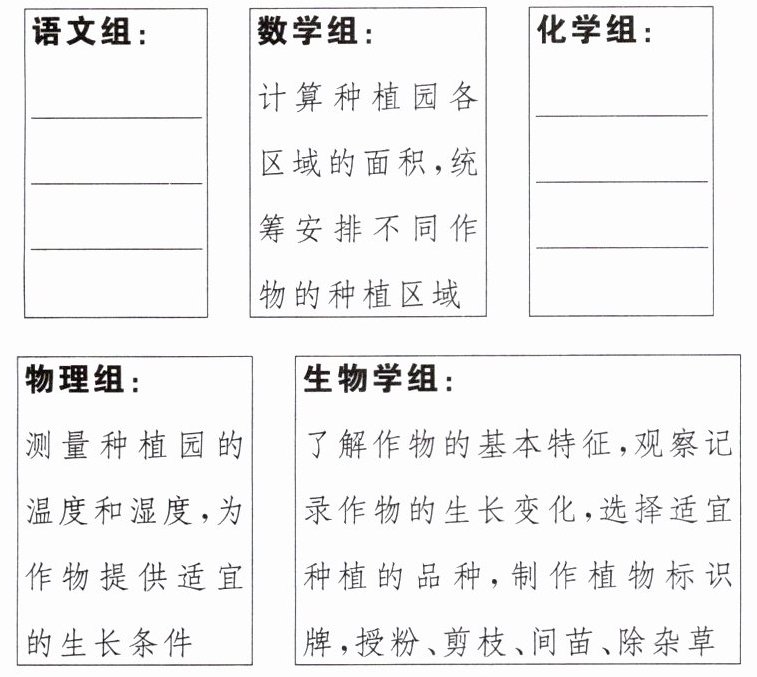 (2)【示例】语文组:撰写种植日志,编辑种植园宣传稿,总结种植经验,宣传种植知识。化学组:测量种植园土壤的酸碱度,确定能够种植的作物类型。