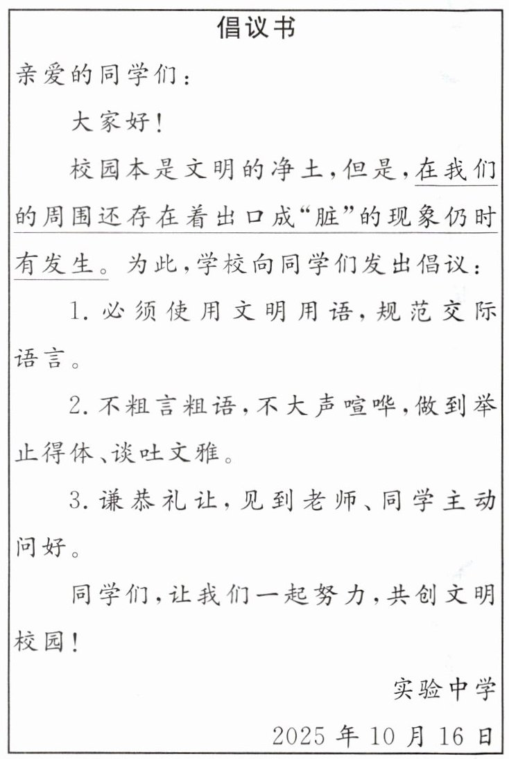 ②倡议书的格式有一处不规范,请提出修改意见:_______。