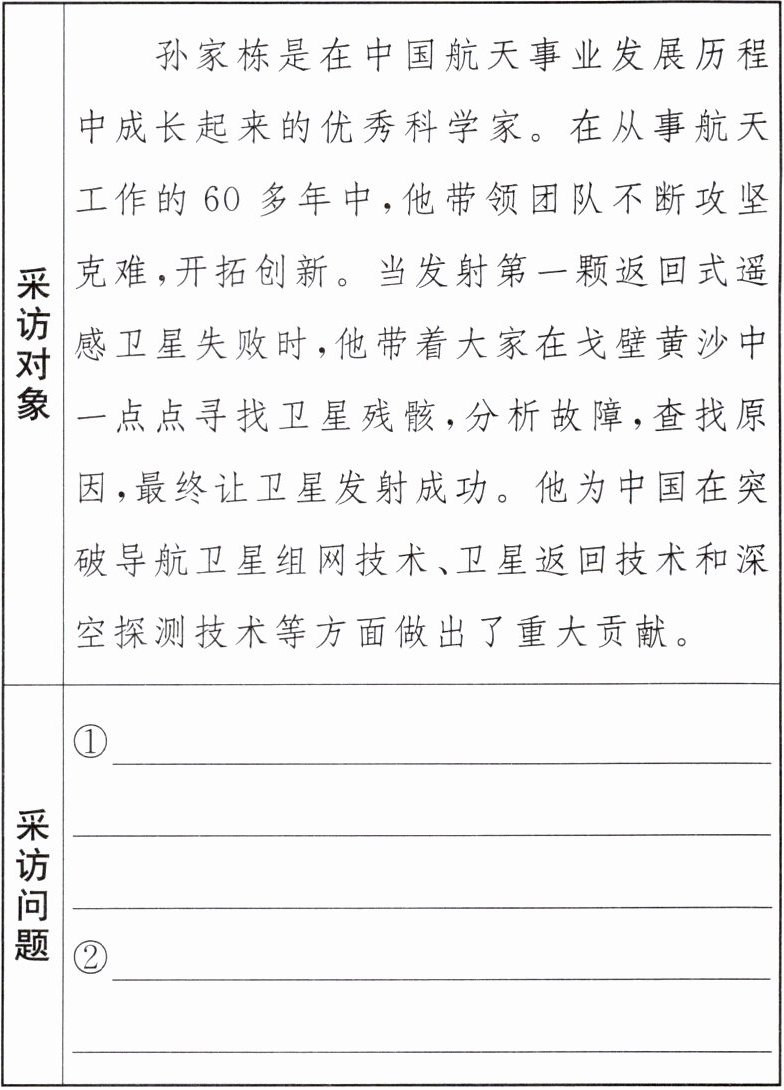 6. 为了弘扬当代自强不息精神,学校计划让你以校报记者的身份去采访航天科学家孙家栋。为完善采访提纲,请你围绕“自强不息”拟写两个采访问题。_______