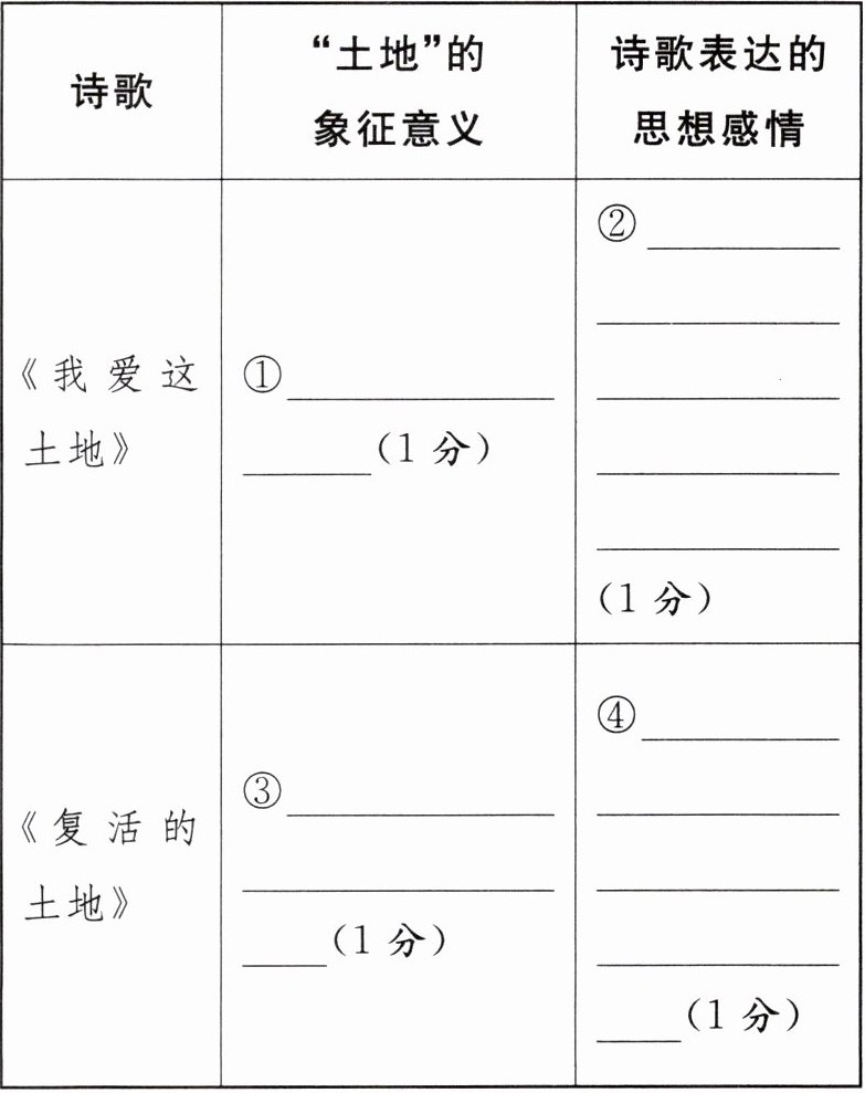 7. 20 世纪 30 年代,艾青诗歌中的主要意象之一是“土地”。比较阅读《我爱这土地》和本诗,完成下列填空。(4 分)【见本课“语文要素点津”】