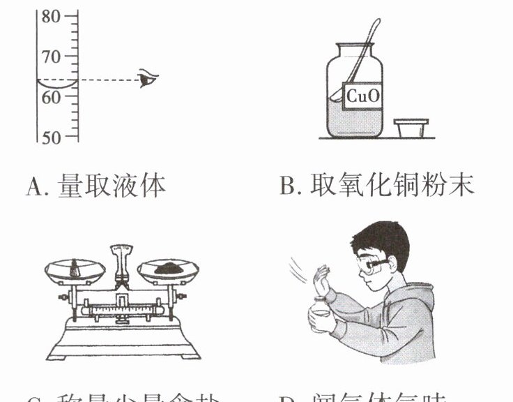 3. 量取一定量的液体试剂时,常用______量出体积。读数时,量筒必须放平,视线与量筒内液体______保持水平。取用少量液体时一般用胶头滴管。取液后的胶头滴管,应保持橡胶帽在上,不要平放或倒置,防止______。