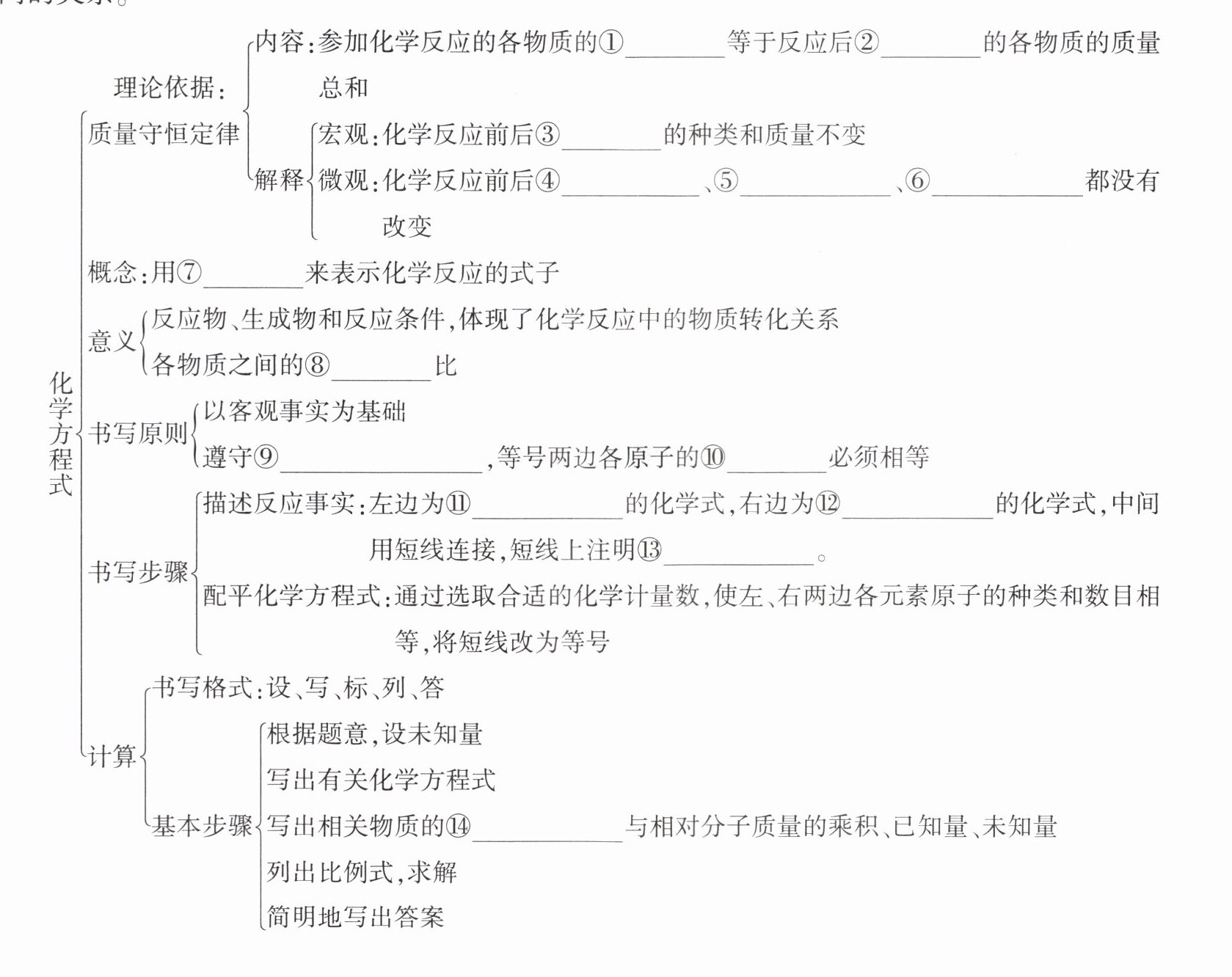 ①质量总和 ②生成 ③元素 ④原子的种类 ⑤原子的数目 ⑥原子的质量 ⑦化学式 ⑧质量 ⑨质量守恒定律 ⑩数目 ⑪反应物 ⑫生成物 ⑬反应条件 ⑭化学计量数
