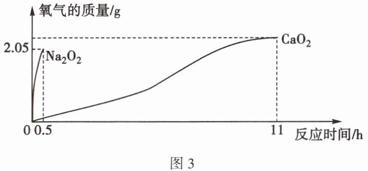(3) 过氧化钙$(CaO_2)$和过氧化钠$(Na_2O_2)$均可作供氧剂。过氧化钙与水反应生成氢氧化钙和氧气。过氧化钠与过氧化钙的化学性质相似。10g过氧化钠固体和10g过氧化钙固体与足量水作用生成氧气的质量与反应时间的关系如图3所示。