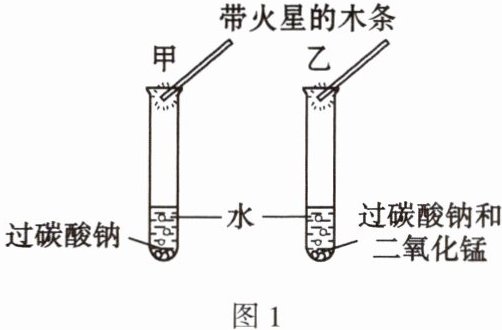 (1) 某制氧机的制氧剂为过碳酸钠和二氧化锰。已知过碳酸钠溶于水产生过氧化氢和碳酸钠。该小组同学用图1所示实验装置探究是否有氧气生成。观察到甲试管中有小气泡缓慢冒出,木条不复燃;乙试管中小气泡快速冒出,木条复燃。