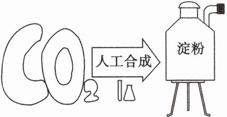 (2)神奇的转化——二氧化碳合成淀粉$[(C_6H_1₀O_5)ₙ]。$中国科学院天津工业生物技术研究所采用一种类似“搭积木”的方式,在实验室中首次实现从二氧化碳到淀粉分子$[(C_6H_1₀O_5)ₙ]$的人工合成。经检测,人工合成淀粉与光合作用生成的淀粉一模一样。