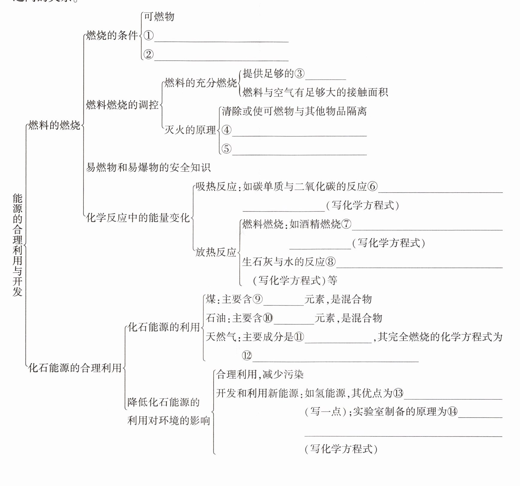 ①氧气(或空气) ②达到燃烧所需的最低温度(着火点) ③氧气(或空气) ④隔绝氧气或空气 ⑤温度降到可燃物着火点以下⑥${CO_{2} + C\xlongequal{高温}2CO}$ ⑦${C_{2}H_{5}OH + 3O_{2}\xlongequal{点燃}2CO_{2} + 3H_{2}O}$ ⑧${CaO + H_{2}O\xlongequal{}Ca(OH)_{2}}$⑨碳 ⑩碳、氢 ⑪甲烷(${CH_{4}}$) ⑫${CH_{4} + 2O_{2}\xlongequal{点燃}CO_{2} + 2H_{2}O}$ ⑬热值高(或燃烧产物为水,无污染) ⑭${Zn + H_{2}SO_{4}\xlongequal{}ZnSO_{4} + H_{2}\uparrow}$