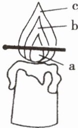 (2) 点燃蜡烛,观察到蜡烛的火焰分为三层。把一根火柴梗放在蜡烛的火焰中(如图)约1s后取出,可以看到火柴梗在火焰的______(填图中字母)处最先炭化(变黑)。