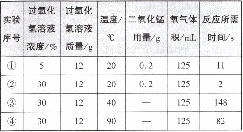 |实验序号|过氧化氢溶液浓度/%|过氧化氢溶液质量/g|温度/℃|二氧化锰用量/g|氧气体积/mL|反应所需时间/s|