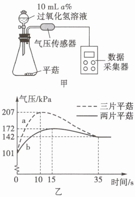 17. 实验小组同学用图甲装置研究浓度为 $ a\% $ 的过氧化氢溶液与平菇接触时发生的化学反应,并用传感器测量装置中气压的变化,同时用数据采集器记录数据如图乙所示。