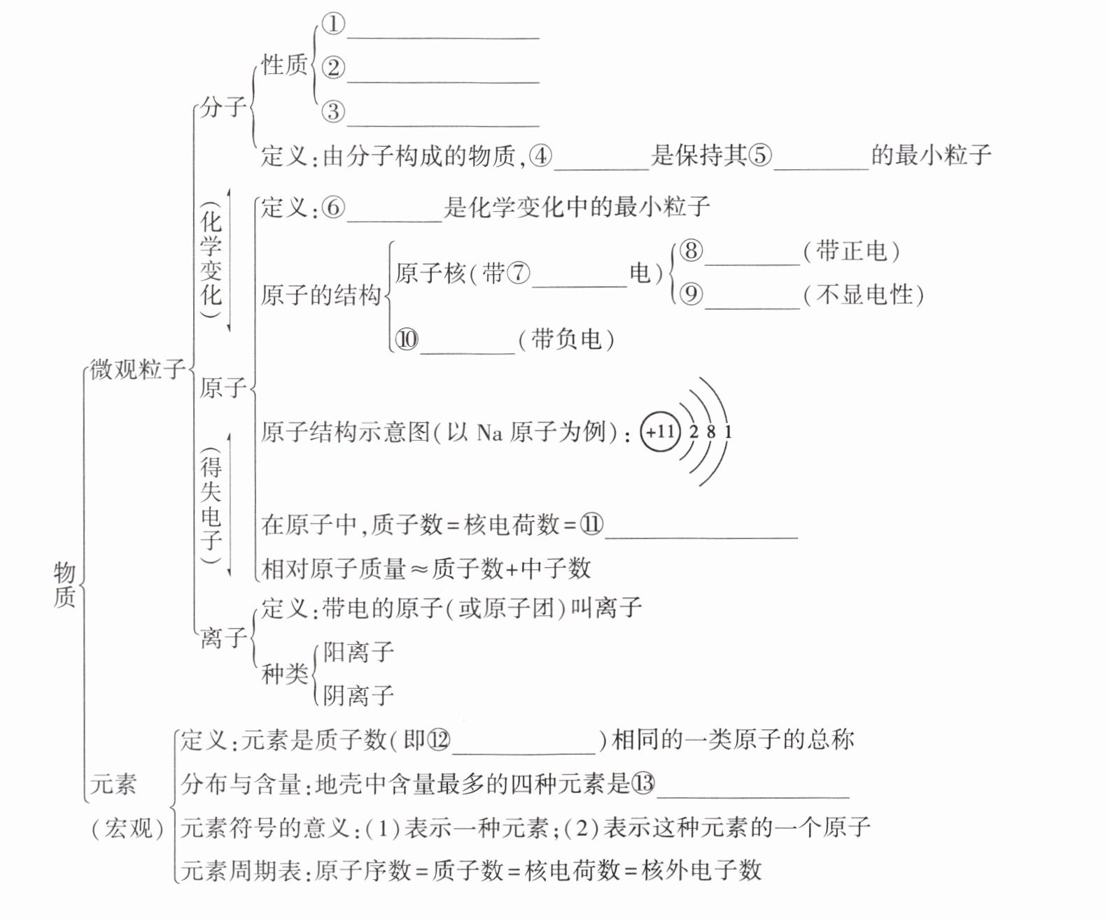 ①分子的质量和体积都很小 ②分子间有间隔 ③分子在不断运动 ④分子 ⑤化学性质 ⑥原子 ⑦正 ⑧质子 ⑨中子 ⑩电子 ⑪核外电子数 ⑫核电荷数 ⑬氧>硅>铝>铁