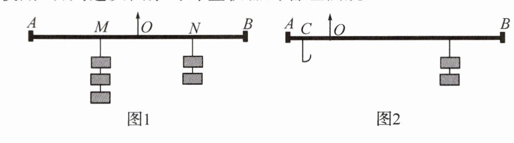 (2)小亮依据上述实验中发现的规律,利用实验中的直杆AB和小金属块制作了一把简易杆秤。如图2,在距离A端4 cm的C处装了一个用来悬挂被称物体的小挂钩(挂钩的质量忽略不计),将支点O设在距离A端12 cm处,用两个小金属块作为秤砣(每个小金属块的质量均为0.2 kg)。