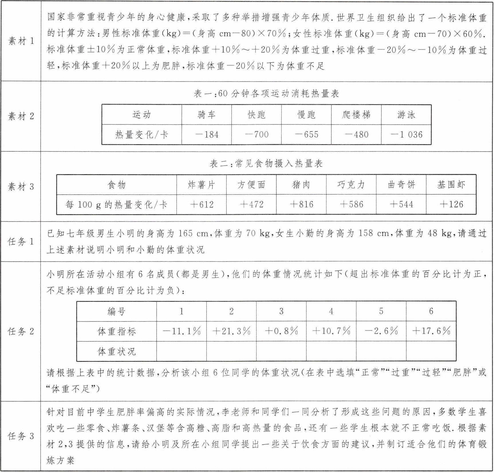 任务3:答案不唯一,例如:饮食方面的建议:少吃炸薯片、巧克力等高糖、高脂和高热量的食品,多吃蔬菜和水果.体育锻炼方案:多做运动,以消耗多余的热量.建议每天坚持跑步,争取每周进行一次游泳运动.