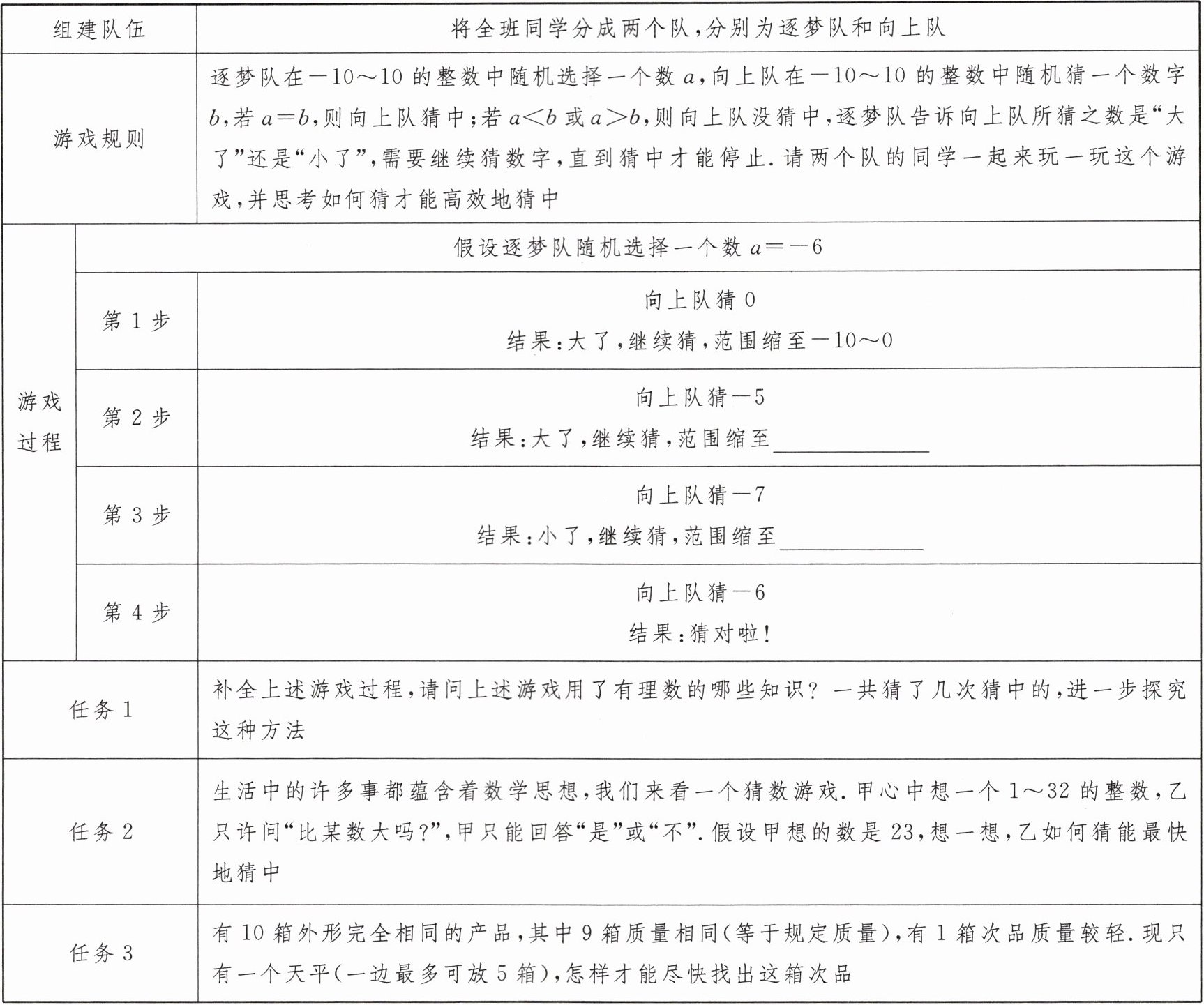 任务1:-10~-5 -7~-5 有理数的大小比较,一共猜了4次,每次都猜最中间的数,逐步缩小范围,直至猜中.任务2:乙可以采用对分法,以下是猜的过程.①乙:比16大吗?甲:是.②乙:比24大吗?甲:不.③乙:比20大吗?甲:是.④乙:比22大吗?甲:是.⑤乙:23.所以乙猜中甲想的数是23.任务3:①将这10箱分成5箱和5箱两部分,则次品在较轻的5箱中;②将较轻的5箱分成2箱、2箱和1箱三部分,则次品在较轻的2箱中;若2箱的两部分一样重,则次品刚好是那1箱;③将较轻的2箱分成1箱和1箱两部分,则次品是较轻的那1箱.
