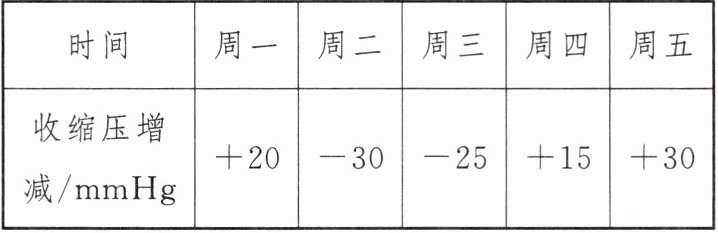 8. 某病人每天下午需要测量血压,该病人上周日收缩压为$120mmHg$.下表是该病人这周每天与前一天相比,收缩压的变化情况,则该病人本周五的收缩压是