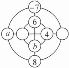 14. 小学时候大家喜欢玩的“幻方”游戏,老师稍加创新改成了“幻圆”游戏.现在将$-1$,$2$,$-3$,$4$,$-5$,$6$,$-7$,$8$分别填入图中的圆圈内,使横、竖以及内、外两圆上的$4$个数字的和都相等.如图,老师已经帮助同学们完成了部分填空,则$a+b$的值为(