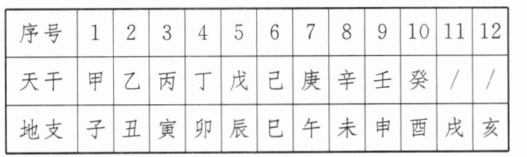15. A兰生复旦校本经典题干支纪年法是中国历法上自古以来就一直使用的纪年方法,干支是天干和地支的总称.干支纪年法的组合方式是天干在前,地支在后,以十天干和十二地支循环配合,每个组合代表一年,$60$年为一个循环.我们把天干、地支按顺序排列,且给它们编上序号.天干的计算方法:年份减$3$,再除以$10$所得的余数;地支的计算方法:年份减$3$,再除以$12$所得的余数.以$2022$年为例:$(2022-3)÷10= 201……9$,$(2022-3)÷12= 168……3$,故天干为$9$,地支为$3$,对照天干地支表得出,$2022$年为农历壬寅年.