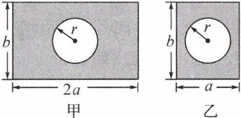 14. 如图,在甲、乙两面墙壁上各挖去一个半径相同的圆形空洞,用来安装窗花,其余部分涂满油漆,则根据图中所标尺寸,两面墙上的油漆面积一共为
