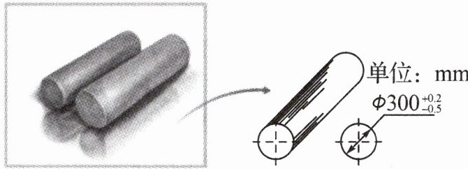 【知识背景】如图,在机械零件图纸上通常用 $\Phi 300_{-0.5}^{+0.2}$ 来表示轴的尺寸加工要求,这里 300 表示直径是 300 mm,-0.5 和 +0.2 是指直径在 (300 - 0.5)mm 到 (300 + 0.2)mm 之间的产品都属于合格产品.