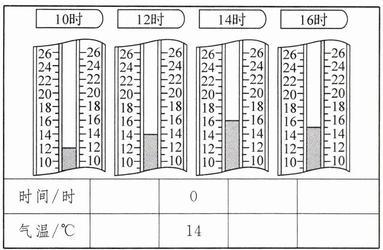 14. 杭州外国语校本经典题 某天 10 时、12 时、14 时、16 时的气温如图所示.记 12 时的时间为 0,12 时以后的时间为正,请用正数和负数表示这四个时间及其气温,并填入下表.