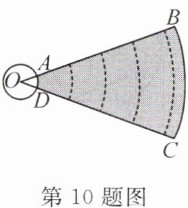 10. 新考向 真实情境(2024·吉林)某新建学校因场地限制,要合理规划体育场地。小明绘制的铅球场地设计图如图所示,该场地由⊙O和扇形OBC组成,OB,OC分别与⊙O交于点A,D。OA=1 m,OB=10 m,∠AOD=40°,则阴影部分的面积为