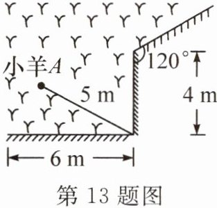 13. 如图,一根5 m长的绳子,一端拴在围墙墙角的柱子上,另一端拴着一只小羊A(小羊只能在草地上活动),那么小羊A在草地上的最大活动区域面积是(
