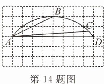 14. 在如图所示的网格中,每个小正方形的边长均为1,点A,B,D均在小正方形的顶点上,且点B,C在$\overset{\frown}{AD}$上,∠BAC=22.5°,则$\overset{\frown}{BC}$的长为