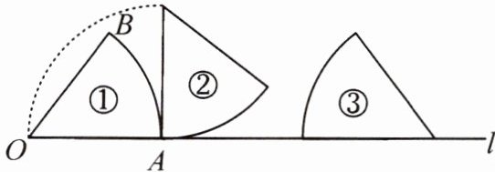 17. 如图,放置在直线l上的扇形OAB由图①滚动(无滑动)到图②,再由图②滚动到图③。若半径OA=2,∠AOB=45°,则点O所经过的最短路径的长是(