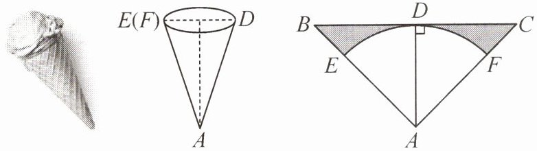 16. 新考向 真实情境 某种冰激凌的外包装可以视为圆锥,它的底面圆直径 $ ED $ 与母线 $ AD $ 长之比为 $ 1:2 $。制作这种外包装需要用如图所示的等腰三角形材料,其中 $ AB = AC $, $ AD \perp BC $。将扇形 $ AEF $ 围成圆锥时, $ AE $, $ AF $ 恰好重合。